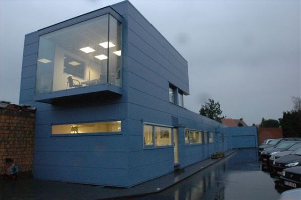 Door te kleine behuizing moest het bestaand tandtechnisch labo uitbreiden. Het gebouw werd uitgebreid tot op zijn uiterste bouwlijnen met achterliggende parkeerruimte voor personeel. De constructiewijze werd industrieel opgevat in staalskeletbouw met sandwichpanelen. De binnenliggende ruimtes werden verlengd en er kwam een aparte buroruimte voor de zaakvoerders met vergaderfaciliteiten. De opbouw herbergt een vergaderruimte annex buroruimte met discreet zicht op de inrit van het terrein (piepend over het bestaande gebouw) én contact met de onderliggende ruimte via een vide. Dit buro werd verlengd met een buitenterras op het dak van de nieuwe uitbreiding. Aan de zijde van de vergaderruimte werd met een hedendaagse variant van een erker verlengd. Door de oplegging van de vloerconstructie op dwarse funderingsstroken lijkt het gebouw lichtjes te zweven. Aansluitend gaat de achtergevel over in twee garageplaatsen.